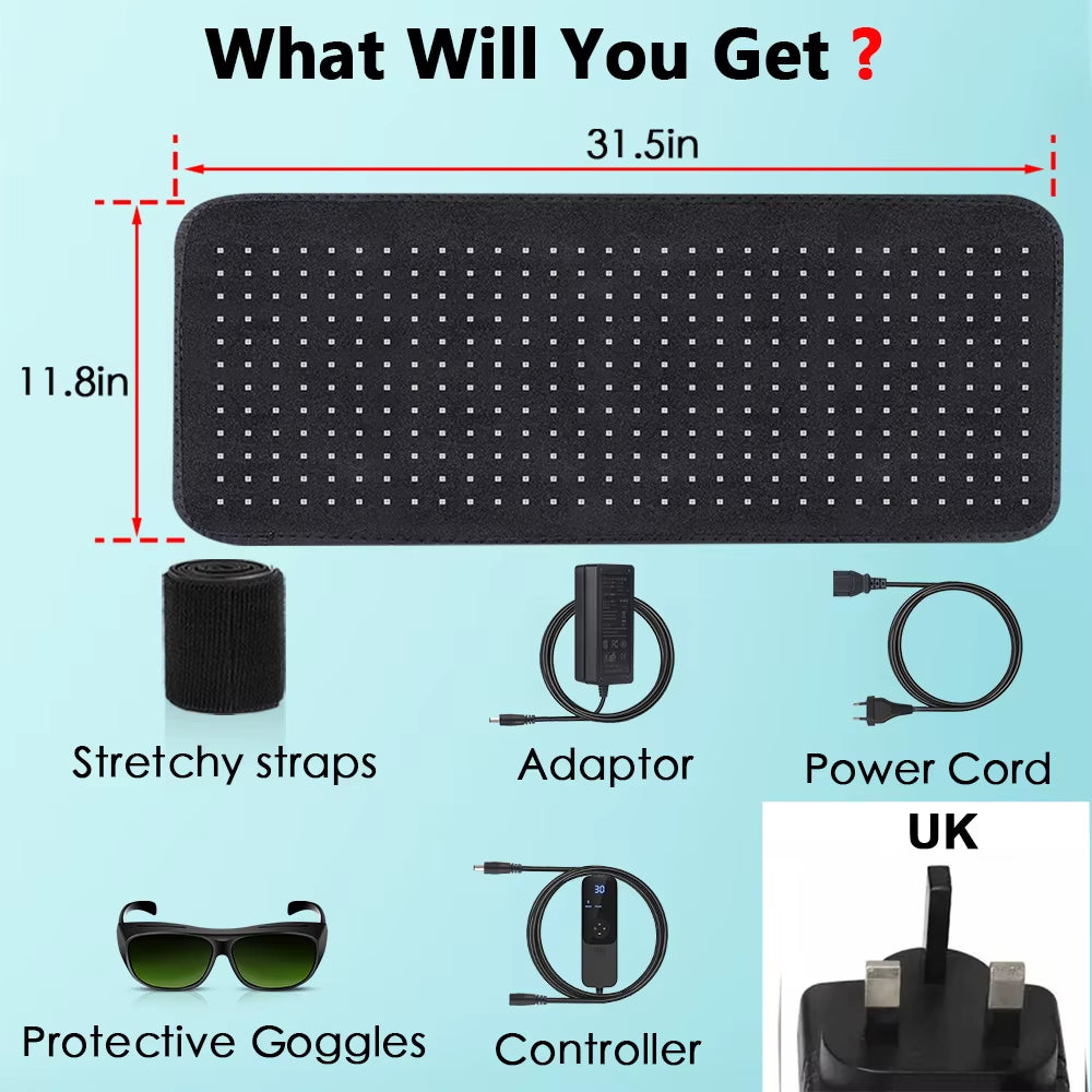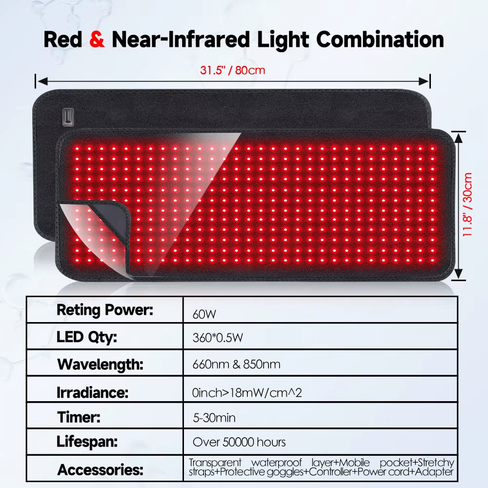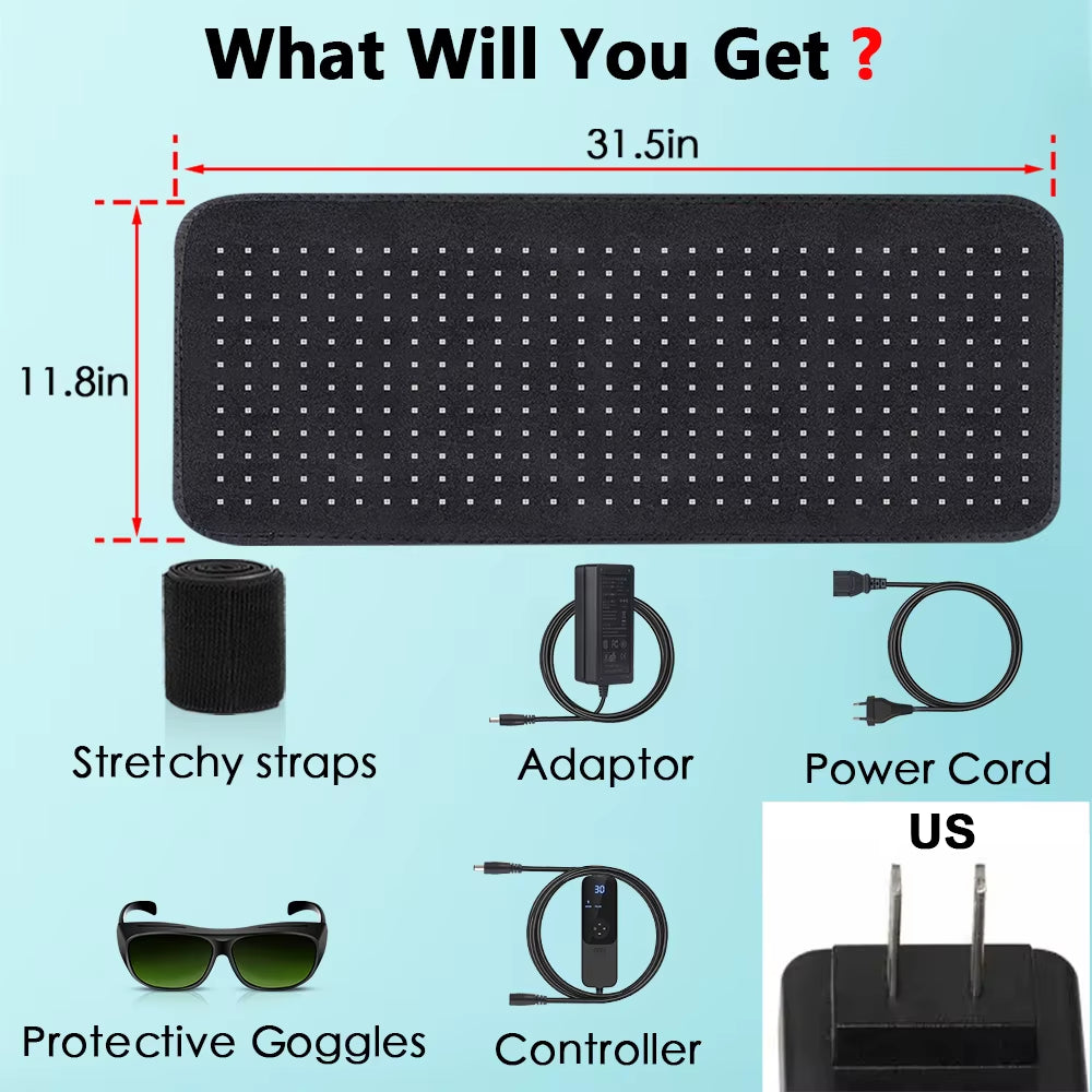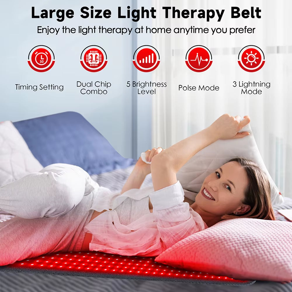 [2025 New Large Pad ] 31.5" x 11.8" large therapy mat, meet the need for treat-ment of the entire back. Heating pad features with 5 adjustable brightness levels, each level has steady luminance and pulse modes, Also equipped with a 10-30 min timer with auto off function.